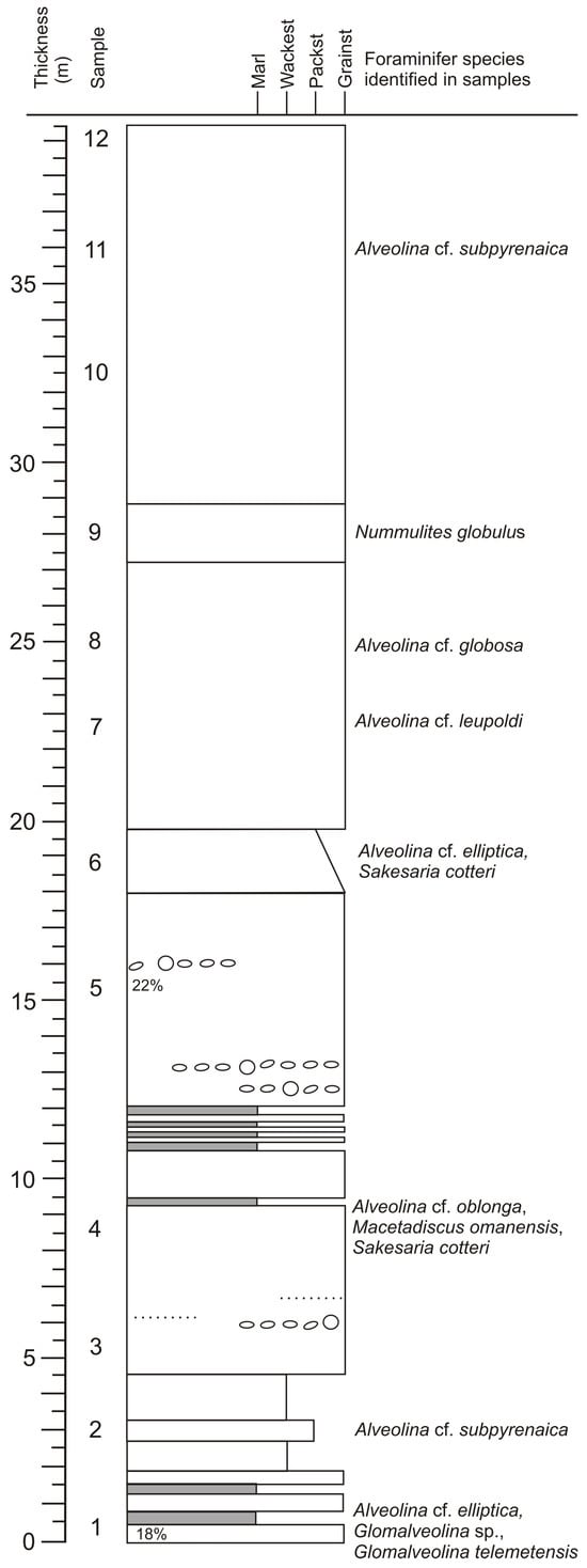 Evidence for the late Paleocene (Sakesaria migiurtina sp., Sakesaria nodulifera sp.) as described by Al-Sayigh [16], was not encountered. The corresponding beds are no longer exposed in the studied section, which is attributed to recent blanketing by scree.