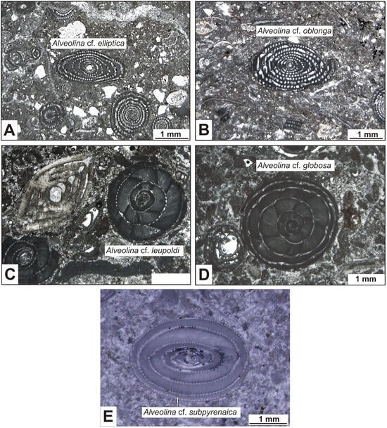 An early Eocene (Ypresian) age of the studied section and a shallow marine depositional environment are indicated by five species of Alveolina (e.g., [60]). In addition, these species represent the upper part of the Jafnayn Formation. These five species are Alveolina cf. globosa Leymerie, 1846, Alveolina cf. subpyrenaica Leymerie, 1846, Alveolina cf. leupoldi Hottinger, 1960, Alveolina cf. oblonga D’Orbigny, 1826, and Alveolina cf. elliptica Sowerby, 1840 and are shown in Figure 15A–E. Alveolina cf. elliptica may also occur in the mid-Eocene [4]. It is of interest that Alveolina cf. elliptica is present in the lowermost layer of the studied outcrop, not showing any signs of reworking/abrasion (Figure 15A).