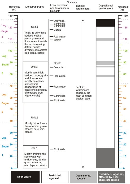 In Figure 16, we break down the lithostratigraphy by subdividing it into four different units based on bedding style, limestone types, presence of a few thin to medium marl deposits, purity of limestones, presence of detrital quartz, and prominence/diversity of bioclasts. Figure 16 also indicates the dominant bioclasts and the depositional environments.