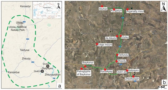Map scheme of Ulytau Geopark (a) and location of main facilities (b).