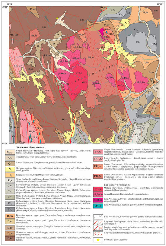 The geological structure of the area involves a complex of sediments belonging to the Precambrian, Lower, Middle and Upper Paleozoic, Mesozoic, and Cenozoic. The petrographic composition of these complexes is also complex and diverse, including crystalline schists, gneisses, Precambrian hyperbasites, intrusives, effusives, pyroclastics, normal sedimentary rocks of the Paleozoic (the degree of metamorphism of which increases from top to bottom) and sedimentary rocks of the Mesozoic–Cenozoic [,,,,,,,,,].
