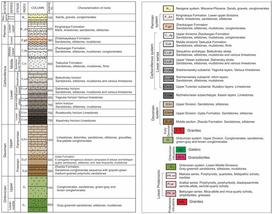 The modern stratigraphy of the Upper Paleozoic is more greatly detailed than the actual stratigraphic scheme and interprets the age of the Zhezkazgan formation differently [,].