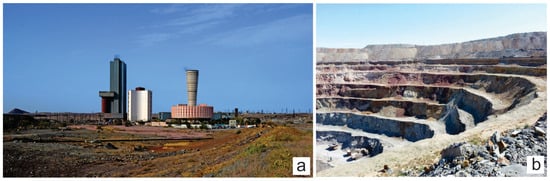 This region is characterised by the largest copper mineralisation and is widely known as “Big Zhezkazgan” [], the centre of non-ferrous metallurgy in Kazakhstan. The subsurface of the region is rich in minerals: copper, iron, manganese ores, polymetals, brown coal, rare metals, etc. It is a mining district whose activities date back to the Bronze Age.