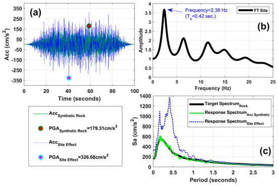 - By means of a convolution process between the Fourier spectrum of the set of synthetic accelerograms in rock and the FT, the respective response spectrum with the site effect on the surface is obtained. Subsequently, through a deconvolution process, the set of synthetic accelerograms on the surface is obtained. Figure 2 illustrates an example of a synthetic accelerogram in rock (Figure 2a) compatible with a target spectrum (Figure 2c) and using the transfer function of Figure 2b and its respective response spectrum (Figure 2c), an accelerogram with the site amplification effect (Figure 2a) is determined. Figure 2 illustrates the amplification in the Peak Ground Acceleration (PGA) and Spectral Accelerations (Sa) in both the accelerogram and response spectrum with the site effect with respect to rock soil.