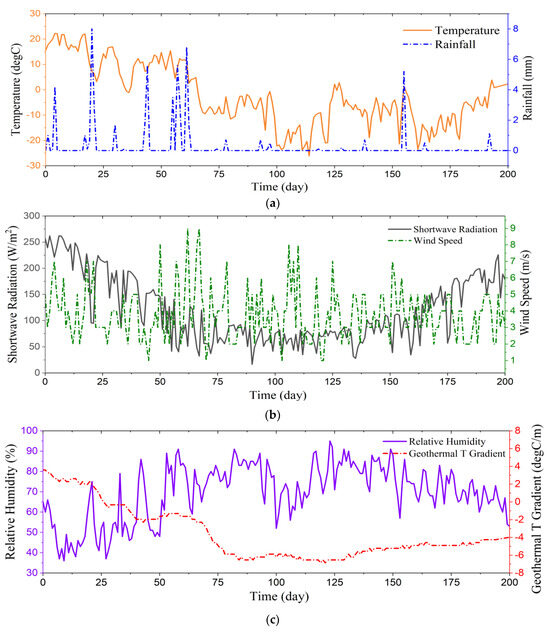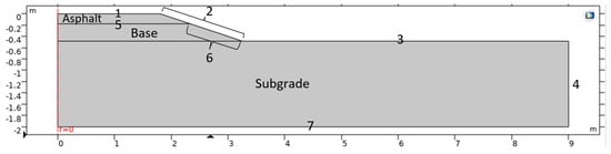 The analysis includes boundary conditions for various environmental factors, assessing the impacts of air temperature, solar short-wave radiation, precipitation, wind velocity, relative humidity, geothermal temperature gradient, and groundwater table elevation. To model the energy transfer between the atmosphere and the pavement surface, the upper three boundaries (boundaries one to three, as shown in Figure 1) are subjected to fluxes from short-wave radiation, long-wave radiation, and air convection. The temperature gradient at the lower boundary is calculated using temperature measurements taken near a depth of two meters, as shown in Figure 2c. This measurement facilitates the calculation of time-varying geothermal flux. The geothermal influence is incorporated by applying a Neumann boundary condition at boundary seven using this flux. Considering the low rainfall intensity and relative high soil permeability, the infiltration capacity is presumed to always exceed rainfall intensity, implying that water flux due to precipitation is the same as the rainfall intensity in the analyzed case. This precipitation flux is applied to boundaries three, five, and six. The GWT effects are simulated by assigning pressure head (Dirichlet boundary) to boundary seven. The right boundary (boundary four in Figure 1) is assumed to be both thermally and hydraulically insulated.
