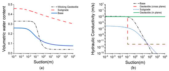 (a) SWCC of base, subgrade, and wicking geotextile, (b) hydraulic conductivity vs. suction of base, subgrade, and wicking geotextile.