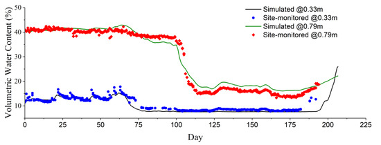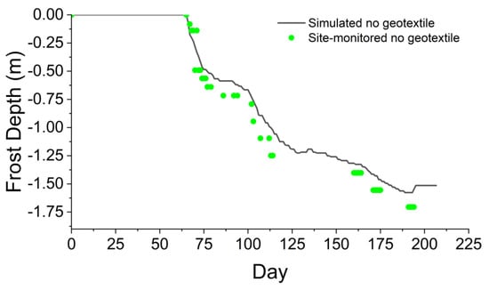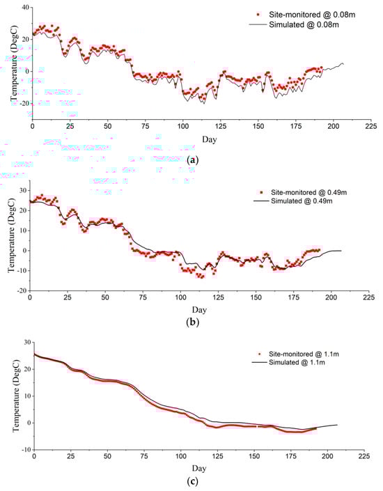 The temperature, water content, and frost depth variation with depth and time are calculated by the proposed model. The results are compared with site-monitored data as shown in Figure 4, Figure 5 and Figure 6, which shows closely matched values. This validates the model’s performance to simulate the thermal and hydraulic filed response of soil to environmental dynamics for the analyzed case. More detailed information about model validations can be found in [19].