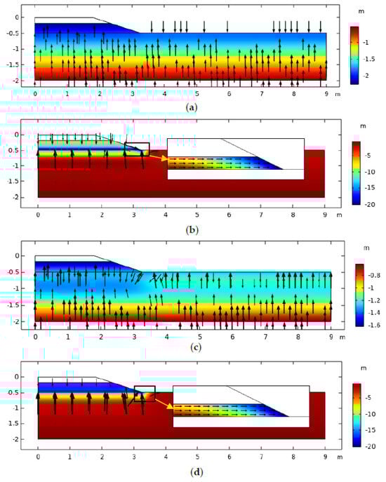 Simulated suction (pressure in m water) distribution and water flow direction on: (a) first day without geotextile, (b) first day with geotextile, (c) twentieth day without geotextile, and (d) twentieth day with geotextile.