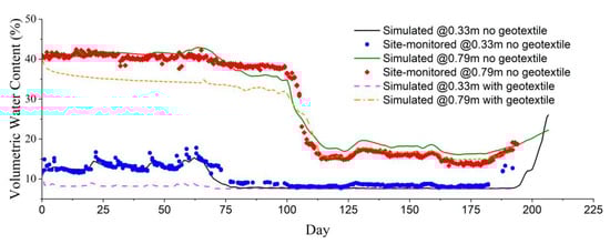 Water content vs. time at 0.33 m and 0.97 m depth, with and without geotextile.