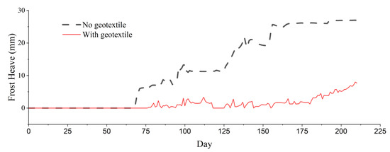 Frost heave (along pavement axis of symmetry) without geotextile installation and with geotextile installation.