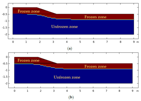 Frost depth spatial distribution comparison between (a) without geotextile installation and (b) with geotextile installation on the 80th day in simulation.