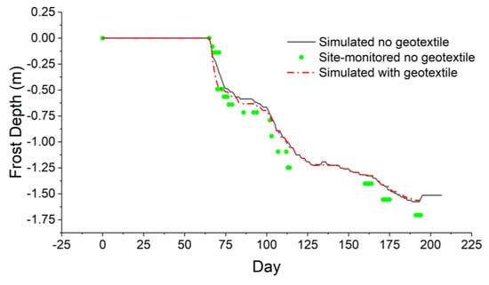 According to the simulated results, it is interesting to note that geotextile has inappreciable effect on frost depth. Figure 11 shows the freezing conditions on the 80th day. It classifies the pavement into a frozen zone (with red color) and an unfrozen zone (with blue color) based on the freezing temperature of pore soil water. As seen in Figure 11, the wicking geotextile has barely any impact on frost depth distribution in pavement and ground. Although the wicking geotextile removes the soil water from the subgrade (Figure 9) and decreases the heat capacity, the induced larger volumetric air content decreases the soil thermal conductivity at the same time. As a result, the ground freezing speed does not change greatly, and frost depth is not significantly influenced. This conclusion can also be supported by Figure 12, which displays the frost depth vs. time, with and without geotextile.