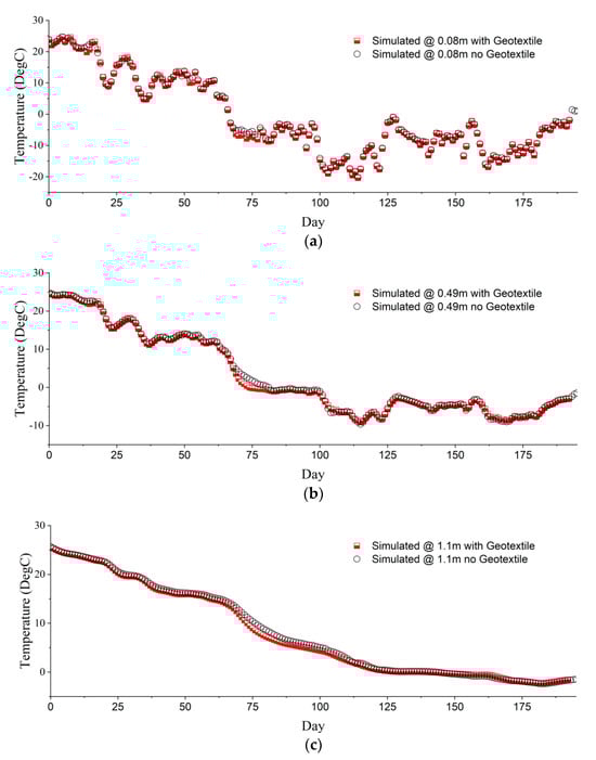 The simulated temperature variations over time, both with and without the geotextile, are compared at various depths of each pavement layer. As depicted in Figure 13, the simulations reveal that the wicking geotextile exerts a negligible influence on temperature fluctuations over time. This observation aligns with the findings presented in Figure 11 and Figure 12. A marginal decrease in temperature was noted between the 62nd and the 112nd days in the presence of the geotextile. This slight temperature reduction is likely attributable to the diminished release of latent heat, which is a consequence of water drainage facilitated by the geotextile.