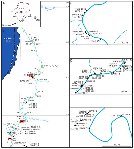 (A) Map of Alaska with a star showing location of study area. (B) Map of Kukpowruk River showing locations of fossil vertebrate tracksites (designated by combination of numbers and letters) in this study, and fossil plant sites (designated by only numbers) from study by Spicer and Herman [12]. (C–E) More detailed maps of areas of high concentration of fossil footprint sites.