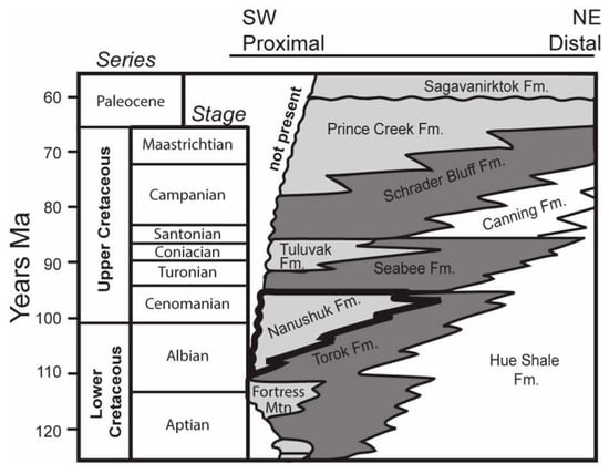 The Nanushuk Fm. and coeval upper Torok Fm. fill the western part of a large, east–west trending, peripheral foreland basin across the west-central North Slope of Alaska. The basin is bounded to the south by the Brooks Range fold and thrust belt [13]. The fold and thrust belt comprises a succession of sedimentary rocks thrust northward that are partly contemporaneous with rifting on the northern flank [13,14]. The Colville foreland basin formed due to the load imposed by thrust faulted allochthons within the growing Cretaceous Brooks Range, followed by sediment deposition eroded from them. Orogen-wide uplift and erosion between 135–95 Ma resulted in the deposition of clastic sediments to the north and northeast, including early Albian to Cenomanian fluvial–deltaic strata of the Nanushuk Fm. [15,16].