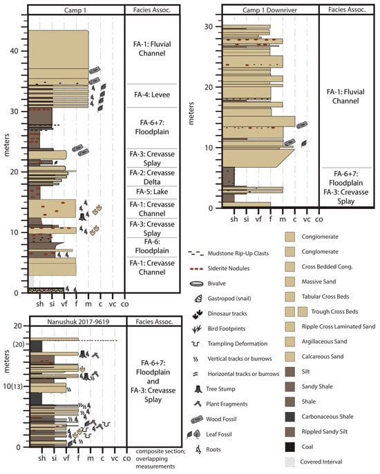 Representative measured sections of fluvial sedimentary successions along the Kukpowruk River, NW Alaska. Legend is shown in lower right. Representative measured sections of fluvial successions along the Kukpowruk River, NW Alaska. See Figure 3 for legend. Representative measured sections of fluvial successions along the Kukpowruk River, NW Alaska. See Figure 3 for legend.