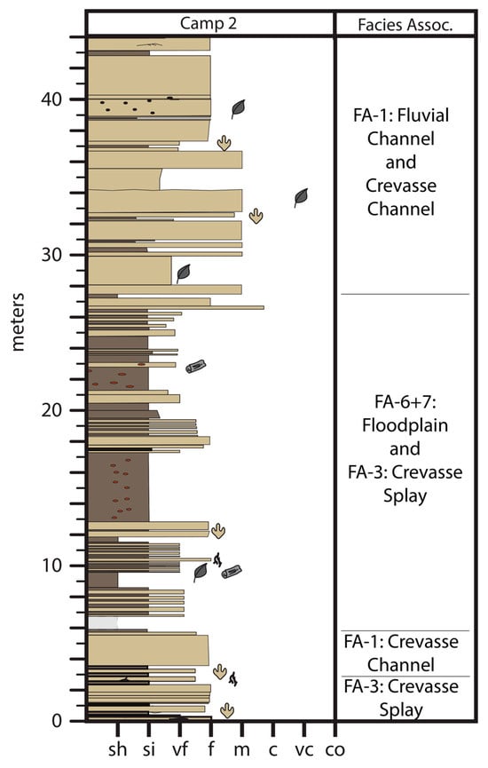 The sheet-like form of these beds, along with a variety of current-formed structures, suggests non-channelized flow [43,44]. The grain size and bedforms suggest bedload and suspended load were simultaneously deposited. The presence of root traces throughout this facies association suggests that episodic aggradation allowed vegetation to recolonize following deposition. Organic-rich interbeds suggest the presence of organic litter that was buried by subsequent floods. This facies is interpreted to represent levee deposition [42,46].