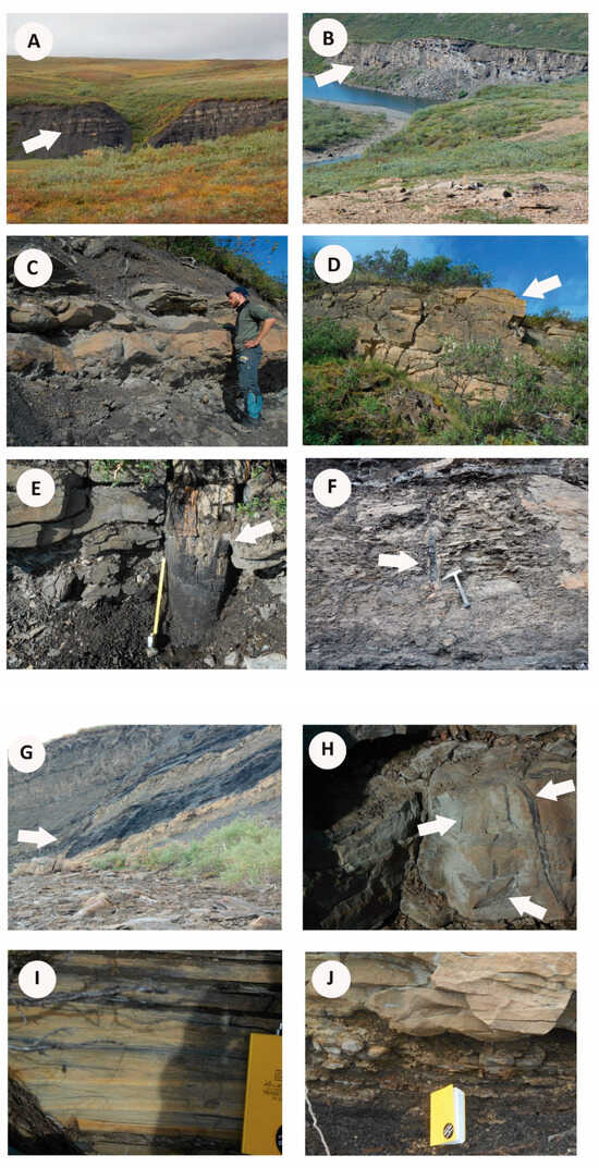 While the Nanushuk Formation encompasses marine and nonmarine facies, this paper focuses primarily on nonmarine fluvial sediments of the rock unit that are exposed along the upper Kukpowruk River (Figure 4). Plant fossils, reflecting successional, riparian, and interfluve environments (Figure 5A) [12], and upright tree trunks in situ (up to 58 cm diameter) are relatively common in nonmarine facies along the Kukpowruk River.