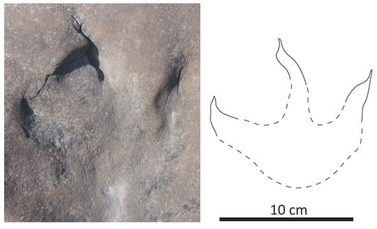 The most abundant avian theropod tracks are small with three slender toe impressions (Figure 8). The individual pes impressions are typically wider than long, though some are approximately as wide as long. Lengths within all tracks found range from 3.1 to 6.9 cm, though the majority are approximately 4 cm long. Similarly, widths within all tracks were found to range from 4.1 to 7.1 cm, while most tracks have an approximate 5 cm in width. Hallux (digit I) impressions are absent, though two tracks (Figure 9) have a suggestion of hallux. Those without a hallux impression can be attributed to the ichnogenus Aquatilavipes. Digit III for these tracks is the longest and digit IV is approximately the same length as digit II. The morphology of this fossil track compares well with the Aquatilavipes swiboldae from the Aptian of British Columbia [61]. The tracks with a suggestion of a hallux are tentatively assigned the ichnogenus Ignotornis, though the webbing that can be associated with this ichnogenus [62] was not observed. Both ichnotaxa have been reported in several rock units in western North America, as well as Asia [61,62,63,64,65].
