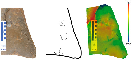 Small tridactyl tracks with three slender toe impressions attributable to avian theropods. The heat map (right) signifies red for higher elevations and blue for lower elevations. The scale bar is in centimeters.