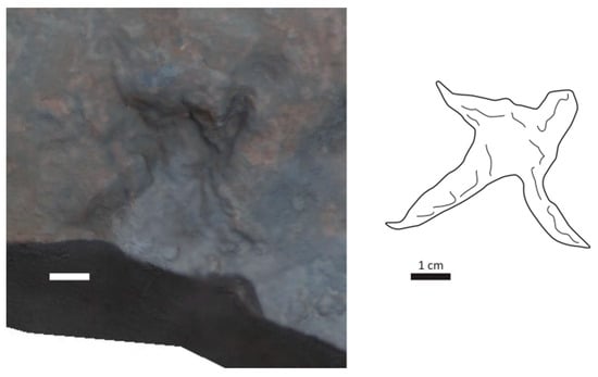 The second pattern observed in tracks attributable to quadrupedal ornithischians are tracks that are more star shaped, with defined digits (Figure 12). The track in Figure 11 is a five-toed manual track whose finger impressions are well separated from each other. The track is approximately 15 cm wide and 10 cm long. The first and fifth phalanx impressions are angled more than 180 degrees as in the Tetrapodosaurus borealis holotype (NMC 8556) from the Aptian–Albian Gething Formation [75], which is now widely accepted to belong to Ankylosauria [76].