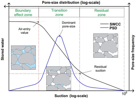 Typical soil–water characteristics and pore size distribution curves.