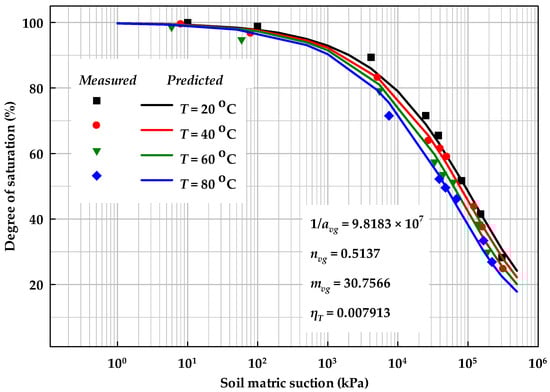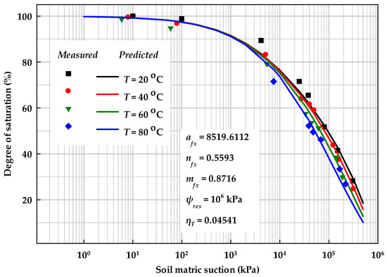 It should be noted that residual suction ψres in Equation (30a) is regarded as a model parameter to obtain the best model performance. Equation (30b) is a general equation for predicting SWCC under temperatures, salt solutions, initial stress states, and initial water contents at dry of optimum side. Equation (30c) is suggested for predicting SWCC for both the wet of optimum side from optimum and dry of optimum sides. More information related to this method is available in []. The model results for THMC (e.g., temperature, salt solution, initial stress state, and initial water content) effects are highlighted in Figure 8, Figure 9, Figure 10 and Figure 11, respectively.
