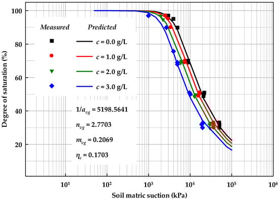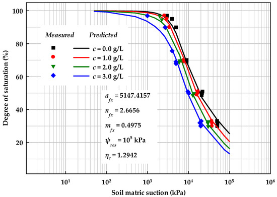Figure 4 and Figure 9 present SWCC prediction model results for salt solution effects, based on experiments presented in the literature []. Note that, in this study, only variation in matric suction was modeled, and the influence of osmotic suction was not considered. As shown by the van’t Hoff equation for osmotic pressure, osmotic suction should be treated as a constant under a certain solution concentration. However, due to electrical double layers around clayey particles, the ion concentration may not be constant in free water of unsaturated soils.