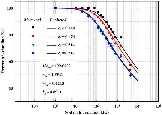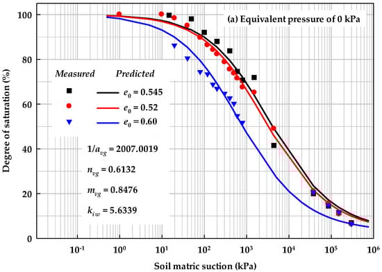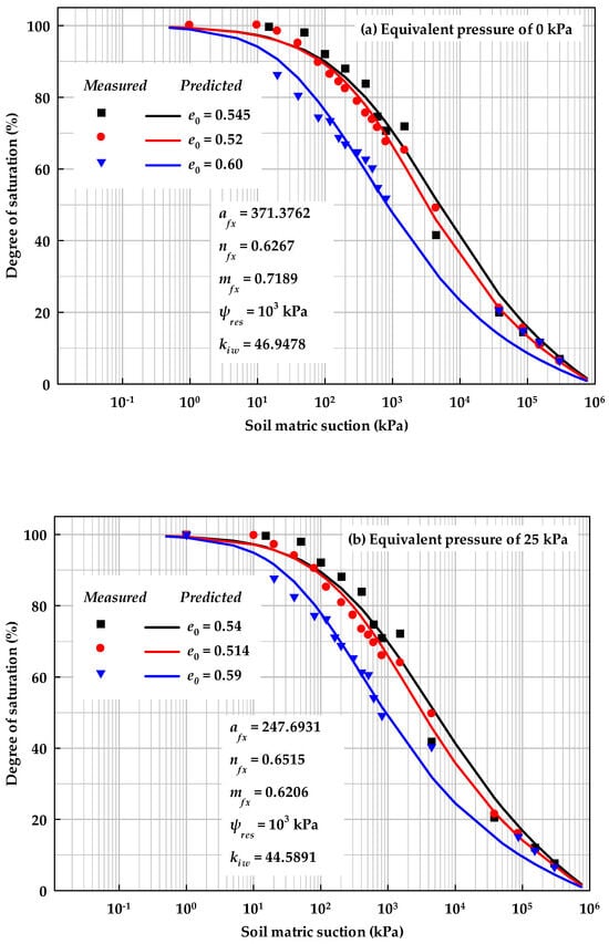 Figure 5 and Figure 10 present the initial stress state effects on SWCCs based on the experimental results in the literature []. Here, the initial void ratio is adopted instead of the initial compact pressure, as the void ratio is a smaller value and will increase the flexibility of the proposed models.