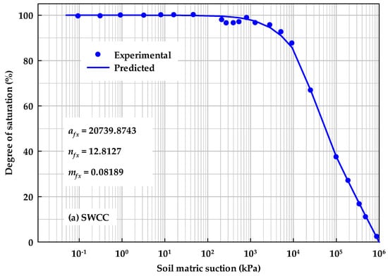 Figure 7 demonstrates the reason to treat the residual soil suction as a model parameter. Experimental data were gathered from []. As highlighted in the figure, a relatively smaller residual suction value can also be used to predict SWCC effectively. This perhaps owes to the flexibility of SWCC equations. Another reason, as discussed in the previous section, may be a feature of SWCC, whereby the correction function is highlighted in a high soil suction range (e.g., larger than 105 kPa) while the residual value (104 kPa in Figure 7b) might be more related to the turning point in the correction function before the soil suction limit (e.g., 106 kPa). The gap between the roles of the correction function and the residual suction inside the correction function reserves space for modeling SWCCs flexibly.