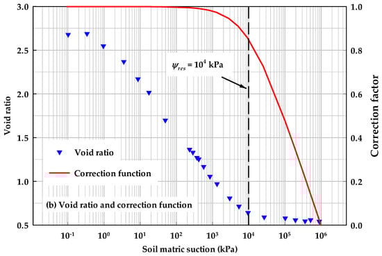Figure 6 and Figure 11 further highlight the prediction results of the initial water content effects on SWCCs, as determined using experimental results from the literature []. In Figure 10 and Figure 11, the residual soil suction is regarded as a model parameter. Note that its value might not represent the exact amount of soil residual suction. The associated variation in PoSD is highlighted based on Equations (30), while the physical meanings of the parameter are omitted.