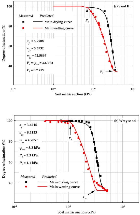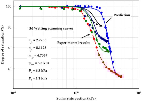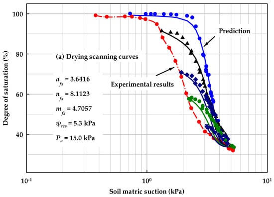 Figure 13 and Figure 14 highlight the model results for hysteretic behaviors of SWCCs. Solid lines and dots are prediction and experimental results, respectively for Figure 3, Figure 4, Figure 5, Figure 6, Figure 7, Figure 8, Figure 9, Figure 10, Figure 11, Figure 12 and Figure 13 and Figure 14b. A distinct parameter afx value for the main wetting curve (i.e., parameter awet) was used to simplify calibration procedures. All the scanning curves in the figures were predicted using Equations (32) and (33), i.e., the correction function in the FX model.