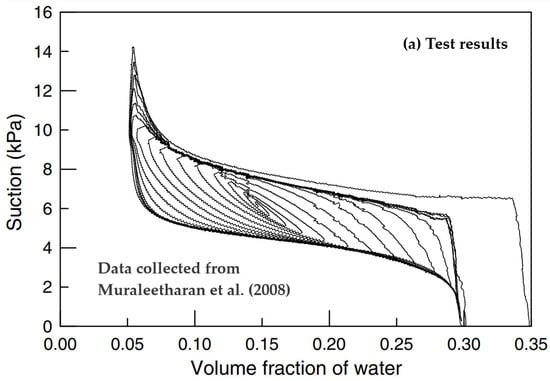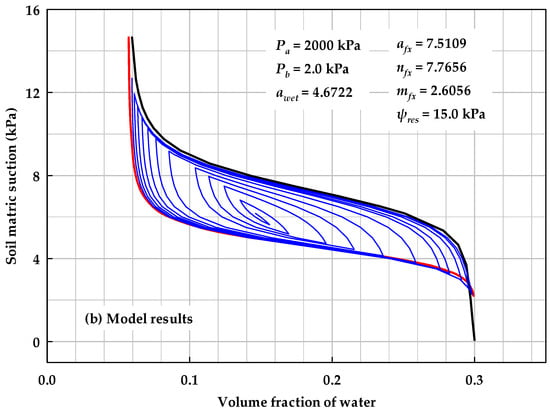 By repeatedly using Equations (5c), (32), and (33), the cyclic wetting and drying behaviors of SWCCs can be readily modeled. The modeling results are highlighted in Figure 14, while experimental results from the literature [] are offered for comparison. One point should be noted: in Figure 14b, the value of parameter afx for the main wetting curve (i.e., parameter awet) differs from that for the main drying curve.