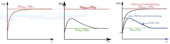 Nitzsche and Herle [] proposed the concept of strain-dependent slope stability where a calculation of the factor of safety can be performed considering a particular failure mechanism using FEM results with any constitutive model describing the soil behavior. A predefined slip surface is chosen and discretized into a number of segments using user-defined nodes. A predefined stress field is necessary (obtained by finite element simulations), so that the stresses for each node are interpolated and rotated in the direction of the predefined slip surface. The factor of safety is defined based on the mobilization of shear stresses considering the stress–strain behavior. The stress–strain behavior is simulated by performing a numerical element test (simple shear, triaxial or biaxial compression tests) for each node, which yields the evolution of shear stress mobilization with the increase in shear strains. The global mobilized shear resistance ratio for the particular slip surface is thus determined by the summation of the mobilized shear stresses with respect to the shear strain along the nodes i, divided by the sum of initial shear stresses of each node i.