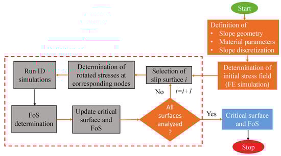 SDSS enables the evaluation of the FoS considering advanced constitutive models by performing element tests for nodes located along a potential slip surface. Different shapes of the slip surface can be used, such as planar or circular slip surface considering a translational or rotational failure of the soil above the slip surface, respectively. In this study, circular slip surfaces are used as planar surfaces tend to yield non-conservative results. The general workflow to detect the critical slip surface associated with the smallest FoS is depicted in Figure 2.