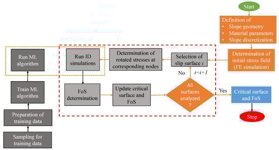 To detect the critical slip surface, SDSS requires the evaluation of element tests at multiple points along potential slip surfaces. Furthermore, searching for the critical slip surface entails evaluating element tests along multiple potential slip surfaces, each with multiple points along the slip surface. Depending on the implemented optimization scheme (e.g., brute optimization, differential evolution [], particle swarm optimization [], genetic algorithms []), and desired accuracy, more than 10,000 element test simulations may be required for identifying the critical slip surface []. Additionally, in case of boundary value problems considering temporal effects, for instance slopes subjected to seismic loading, multiple time steps need to be analyzed, resulting in huge computational cost. Machine learning (ML) algorithms can help reducing the computational costs associated with SDSS significantly by substitution of the computing-intensive Incremental Driver simulations with ML algorithms, as summarized in the flowchart in Figure 3. To replace element test simulations conducted with Incremental Driver by ML, an ML algorithm needs to be selected, data for training and testing needs to be sampled and the ML algorithm needs to be trained first.