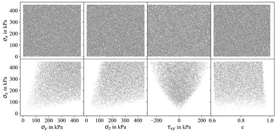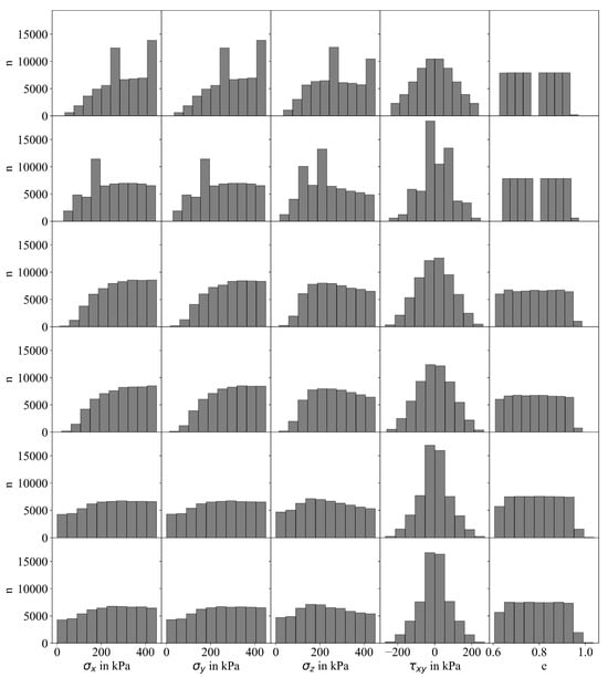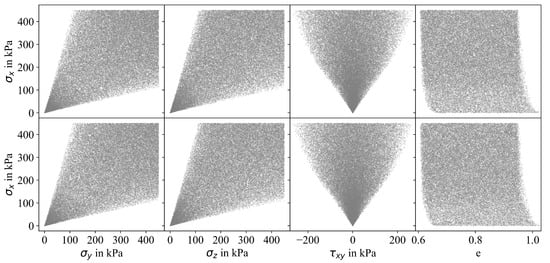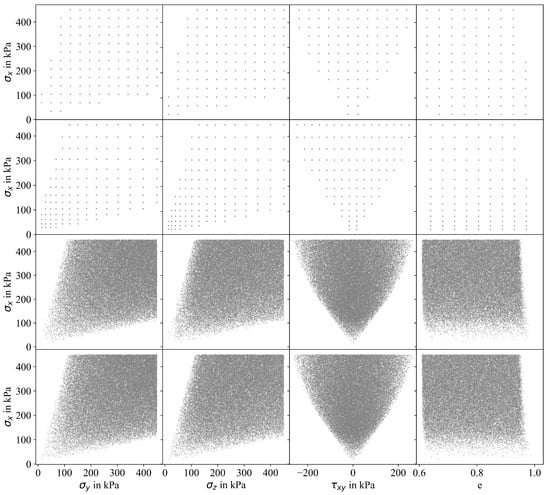 Imposing constraints to the sampling process can significantly reduce the amount of valid samples needed to train the ML algorithms (A sufficient number of samples has to be generated to populate the n-dimensional sampling space considering problem-specific constraints. In general, the process to determine the number of samples is based on trial and error, considering a desired level of accuracy in the predictions). Let us consider 60,000 samples generated using Latin hypercube sampling (LHS) as shown in the top row of Figure 4. When the constraints summarized in Equations (2) and (3) are implemented, a significant reduction of samples is observed as shown in the bottom row of the same figure. Although only four out of ten projections are shown here, the influence of the constraints can clearly be seen. A significant number of rejected samples corresponds to lower stress states (e.g., kPa). Violation of the constraints is more likely for lower stresses due to smaller ranges of admissible stress states. In contrast, significantly more amounts of samples at higher stress levels (e.g., kPa) fulfilled the constraints and, thus, were not removed. In total, consideration of the constraints led to a reduction of the number of samples from 60,000 to approximately 10,000. Although not explicitly depicted here, this issue does not solely apply to LHS, as emphasized in Figure 4, but is also observed for grid sampling with linear or quadratic spacing, Monte Carlo sampling or other standard sampling techniques identical constraints. To ensure that ML algorithms are trained with the intended number of samples—in this case 60,000—that also should not violate the aforementioned constraints, larger initial sample sizes need to be defined. However, following this strategy, the sample distribution will be unsatisfactory as the number of samples accepted for small stresses would still be small compared to those accepted for larger stresses, resulting in an inhomogeneous distribution of samples along the desired stress range. This is also depicted in Figure 5 showing four out of ten projections for approx. 60,000 valid samples that were generated using grid sampling with linear and quadratic spacing (1st and 2nd row), Monte Carlo sampling (3rd row), and Latin hypercube sampling (4th row).