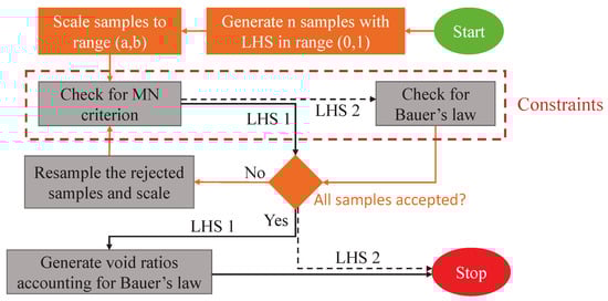 To improve the quality of the sampling, two modified Latin hypercube sampling approaches (LHS-1 and LHS-2) are formulated and schematically presented in Figure 6. Both approaches start with a Latin hypercube sampling with the desired number of samples considering five independent dimensions (, , , , and e). After the generation of samples using LHS within the ranges of 0 and 1, samples are scaled to the desired lower and upper bounds of the respective dimensions. Afterwards, an iterative procedure for both approaches is applied, whereby the workflow of the two algorithms differs slightly. In LHS-1, the constraint limiting unfeasible stress states, for instance violating the Matsuoka–Nakai criterion (Equation (2)), is checked, while in LHS-2, two constraints, the Matsuoka–Nakai criterion (Equation (2)) and Bauer’s law (Equation (3)) are checked. If there are any samples that do not meet the specified constraint(s), they will be resampled. To ensure an adequate number of samples generated at small stress levels, the first stress component () is kept constant during resampling, while the other stress components (, and ) and the void ratio e (only for LHS-2) are resampled using the conventional LHS. This iterative procedure is repeated until all samples fulfill the constraint(s). Based on trial analyses, approximately 1/3 of the initial samples are accepted directly, while additional 30–35 iterations are required for the remaining samples. Note that the overall sampling process including resampling iterations takes less than onew minute. Once all samples comply with the constraint(s), the iteration procedure stops. At the end of the iteration process, LHS-2 approach is finished, while an additional step is required for LHS-1. Sampling and scaling of the fifth dimension (i.e., void ratio) is performed using 1D Latin hypercube sampling considering the individual limiting void ratios in accordance with Bauer’s law (Equation (3)).