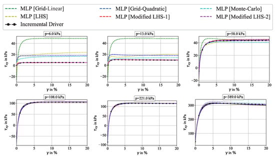 The accuracy of the predictions of the MLP model using different sampling approaches for the 3000 test samples was evaluated in terms of the coefficient of determination limited to . Overall, a good approximation of the shear stress response from ID was obtained with MLP in combination with all sampling approaches, as indicated by coefficients of determination varying in the range (see Table 1). However, the evaluation of regarding different mean stress ranges revealed that the MLP predictions utilizing different sampling approaches varied strongly. The best agreement between ID and MLP was obtained for large mean stress levels ( kPa) for all sampling approaches (). A lower level of agreement was observed for intermediate mean stress levels (20 kPa kPa). In that range, the lowest was obtained using grid sampling with linear/uniform spacing (), while the other sampling approaches resulted in . As expected, no improvement of was seen using the modified Latin hypercube sampling approaches LHS-1 and LHS-2 for large mean stress levels. This can be explained by the smaller number of samples for large mean stress levels. However, as the difference in was small, the predictions of MLP using LHS-1 and LHS-2 for large mean stress levels could be considered accurate. In the case of intermediate mean stress levels, it was observed that the LHS-1 and LHS-2 approaches provided better estimates compared to the other sampling approaches as a result of higher sample densities that could also be seen by comparing the distribution of samples depicted in Figure 5 and Figure 7.