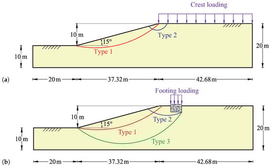 In addition to the FoS, the shape of the critical slip surfaces associated to the smallest FoS was investigated. Note that for the first example, very shallow slip surfaces were mostly expected (failure types 1 and 2 in Figure 10a) since the friction angle governs the shear strength and the surcharge is acting on the top surface. For the second example, shallow (failure type 1 in Figure 10b) and deep (failure types 2 and 3 in Figure 10b) slip surfaces are expected depending on the magnitude of load applied to the embedded foundation. For small magnitudes, shallow slip surfaces might be observed that do not interfere with the foundation, while for increased loads slip surfaces might start right below the foundation. Thus, there should be a threshold load separating different types of slip surfaces. Note that discussions with regard to different types of slip surfaces depending on load magnitudes or interfering objects in close proximity were also provided in previous studies with regard to the bearing capacity problem [,].