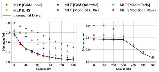 Stability analyses were conducted at predefined load intervals of kPa (example 1) and kPa (example 2) to investigate the influence of the magnitude of loading on the FoS. To study the influence of the sampling approach on the FoS prediction, comparative analyses with multi-layer perceptron (MLP) trained based on different sampling approaches were undertaken, considering the results obtained with ID as the proper solution. In accordance with Section 3.3, four traditional sampling approaches (grid sampling with linear and quadratic spacing, Monte Carlo sampling, and Latin hypercube sampling) and both modified Latin hypercube sampling approaches (LHS-1 and LHS-2) were considered for the FoS estimation of both slopes. Although grid sampling with linear spacing provided inaccurate approximations of the shear stress for small mean stress levels (see Section 3.3), it was included in this section to allow for a comprehensive comparison of the FoS predictions.