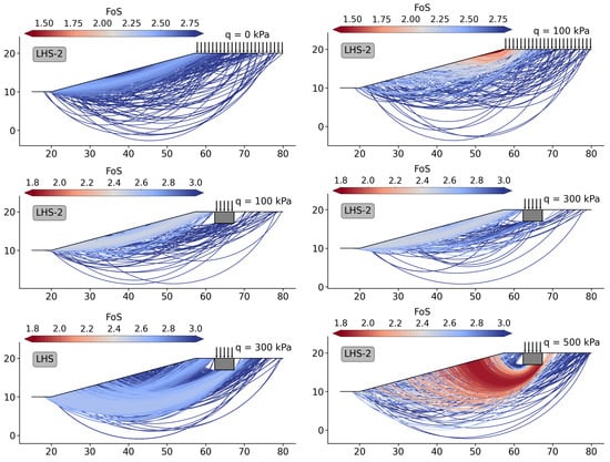 As discussed in the previous paragraph, the FoS versus load curve for the slope example 2 presented in Figure 11-right is characterized by a distinct kink at kPa. Following the discussions of previous works related to the bearing capacity problem [,], this kink in the FoS plot should be accompanied by a switch in the location and shape of the critical slip surface. To check if this reasoning is valid for the two examples studied here, the locations of the critical slip surfaces are analyzed for both examples, considering different loads. Focusing on LHS-2, which resulted in more accurate FoS predictions compared to ID for all load cases, all slip surfaces investigated during the optimization process are plotted in Figure 12 for the example 1 (top row) and the example 2 (middle and bottom row) with colours indicating the level of safety in terms of the FoS. Upon examining the critical slip surfaces for the example 1, it is evident that a large slip surface extends from the crest to the toe of the slope for zero surcharge (failure type 1 as schematically indicated in Figure 10a). With increasing magnitude of the distributed surface load applied to the slope crest, a very shallow critical slip surface is detected close to the slope crest (failure type 2 as shown in Figure 10a). Independent of the sampling approach selected, these two types of slip surfaces are observed, also for stability analyses performed with ID. Note that, although a switch in the critical slip surface is observed here, a kink in the FoS vs load plot was not detected. A potential reason for this is that the switch takes place at very small loads, even below the first load increment of 20 kPa investigated here.