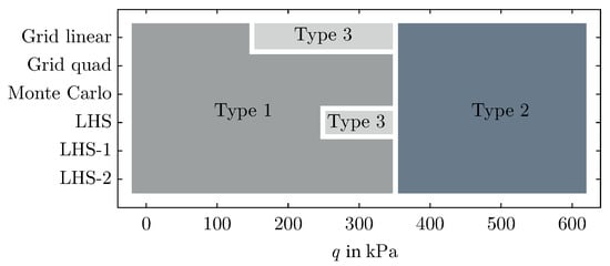 When analyzing the critical slip surfaces for the example 2, shown in the middle and bottom rows of Figure 12, it becomes evident that a similar critical slip surface is obtained in the example 1 without surcharge as in the example 2 when the surcharge is kPa and kPa (failure type 1 as shown in Figure 10b). Note that the FoS remains unchanged, as well, since the stress level in the shallow parts of the slope is not influenced significantly by the external load acting on the embedded foundation. However, once exceeding a threshold load, the location and shape of the critical slip surface changes, leading to a failure below the embedded foundation (failure type 2 in Figure 10b) as indicated in the bottom right subfigure for kPa. Interestingly, a third type of critical slip surface (failure type 3 in Figure 10b) is observed applying grid sampling with linear spacing as well as traditional LHS sampling, the latter shown for kPa in the bottom left subfigure. This type 3 failure is obtained for moderate stresses and spans from the right corner of the foundation to the slope toe. As also type 2 failure is observed for grid sampling with linear spacing as well as traditional LHS sampling considering higher loads, this observation allows to conclude that there should be even two thresholds loads for the application of embedded foundations in close proximity of slopes, where the first transition happens between type 1 and type 3 and the second between type 3 and type 2. Thus, starting with type 1 and increasing the load on the embedded foundation, first, the crest point of the critical slip surface moves towards the foundation corner (type 2) and afterwards, the toe point moves upwards along the slope until reaching type 3. Figure 13 summarizes the observed changes in the typology of the failure mechanism as function of the increasing load on the footing for the example 2, considering all the studied sampling methods. The influence of sampling is evidenced for grid sampling with linear spacing and Latin hypercube sampling because a transition between failure type 1 and type 3 appears at different values of the applied loading, whereas that transition is not observed for the other sampling techniques, where a change between failure type 1 and type 2 occurs at kPa. Still, further investigations with smaller load increments are required to precisely detect this transition, expecting also to observe a second kink in the FoS versus load curves for the results of those investigations.