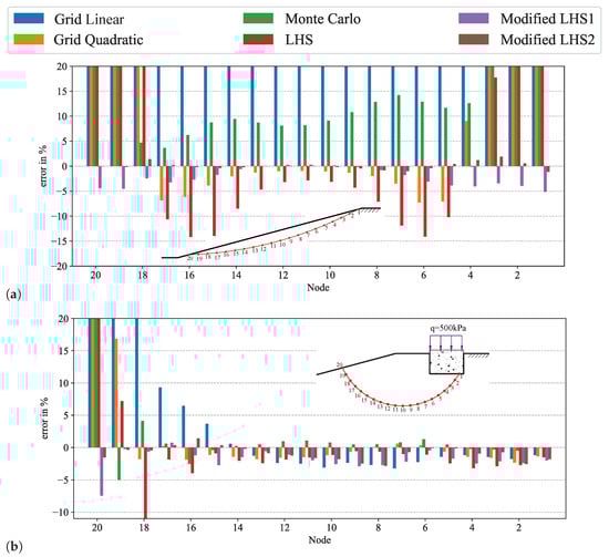 For the second example, considering a footing load of kPa, a large variation of the relative error was observed depending on the position of the node on the slip surface. For nodes 1–16 below the foundation as well as at greater depth, were obtained, whereas huge deviations were observed for nodes in close proximity to the slope surface. For this second example, a more consistent trend in the errors for nodes 1–14 was calculated for all sampling methods, where except for Monte Carlo and grid sampling with quadratic spacing, the errors were negative and did not exceed . Monte Carlo overestimated the shear stress for most of the nodes closer to the free surface (nodes 14–20). Modified LHS-1 showed an underestimation of at the last node on the slope surface, whereas LHS-2 produced a smaller error of . For the same node 20, the other sampling methods showed an overestimation of more than . In summary, the LHS-1 and LHS-2 methods had smaller errors in shear stress, with LHS-2 consistently outperforming LHS-1.