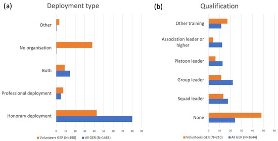 Figure 1), the majority are not qualified persons (volunteers: 48%; all: 24%), followed by other training (volunteers: 17%; all: 12%). Specific training starts highest with the lowest qualification, squad leader, and ends with the leader of an association or higher. The chi-squared test result was