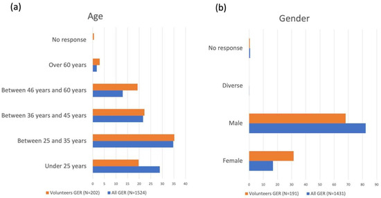 p < 0.05 (0.010). Gender distribution shows the majority to be men (volunteers: 68%; all: 82%), with fewer women (volunteers: 31%; all: 17%). There were more female voluntary helpers than in the “all” group. The categories “diverse” or “no response” were up to or below 1%. The chi-squared test result was