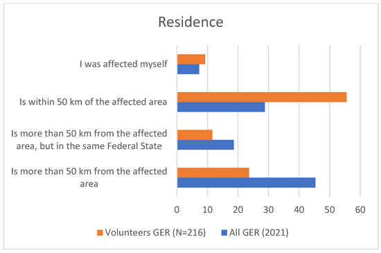 Figure 3), the majority lived within 50 km of the affected area (volunteers: 56%; all: 29%), and some were affected by the floods themselves (volunteers: 9%; all: 7%). A share of respondents came from an area more than 50 km away (volunteers: 24%; all: 45%), and some were more than 50 km away but lived in the same federal state (volunteers: 12%; all: 19%). The chi-squared test result was
