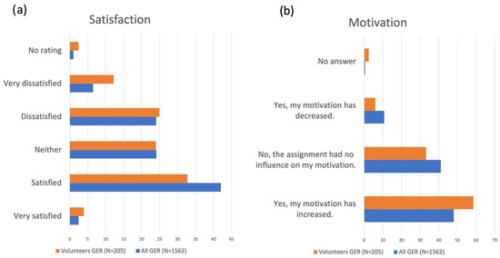 Figure 4), the majority had increased motivation (volunteers: 59%; all: 48%), followed by no influence on motivation (volunteers: 33%; all: 41%). The motivation decreased for fewer persons (volunteers: 6%; all: 11%). The “no answer” category was selected by a few respondents (volunteers: 2%; all: 0%). The chi-squared test result was