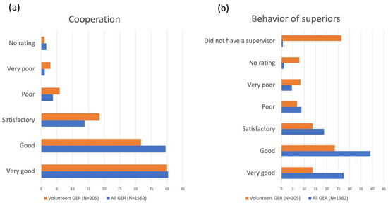 Figure 5), the majority had a positive perception of “good” (volunteers: 23%; all: 39%), “very good” (volunteers: 14%; all: 27%), or “satisfactory” (volunteers: 14%; all: 19%), followed by “poor” (volunteers: 7%; all: 9%) or “very poor” (volunteers: 8%; all: 5%). The “no rating” category was selected by a few respondents (volunteers: 8%; all: 1%). Some also reported not having had a superior (volunteers: 26%; all: 1%). The chi-squared test result was