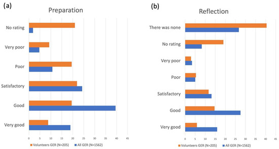 Figure 6), the majority stated there was none (volunteers: 40%; all: 27%). The following had a positive perception of reflection: “good” (volunteers: 15%; all: 28%), “satisfactory” (volunteers: 12%; all: 13%), or “very good” (volunteers: 6%; all: 16%). Some negatively perceived the reflection as “poor” (volunteers: 5%; all: 5%) or “very poor” (volunteers: 3%; all: 3%). The “no rating” category was selected by some respondents (volunteers: 19%; all: 8%). The chi-squared test result was
